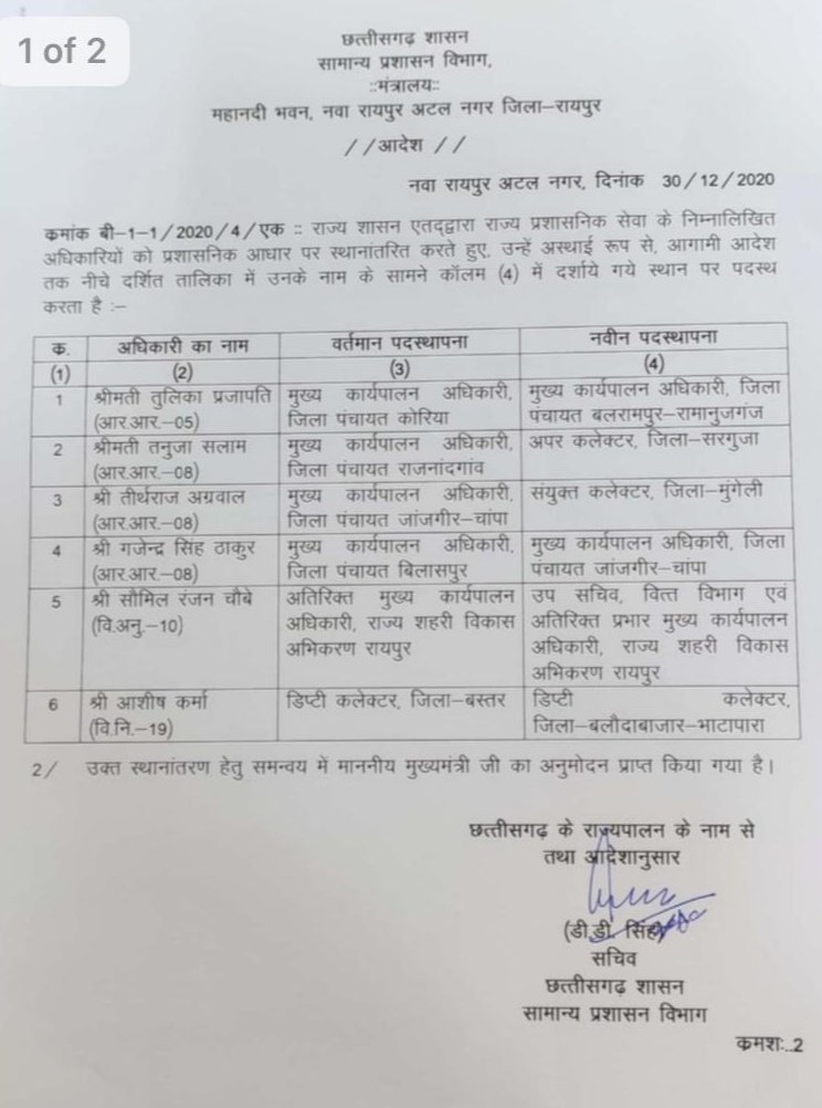 कोरिया जिले की जिला पंचायत CEO तुलिका प्रजापति अब बलरामपुर-रामानुजगंज जिला पंचायत की नई सीईओ होंगी। आज राज्य सरकार ने 6 डिप्टी कलेक्टर रैंक के अधिकारियों का स्थानांतरण किया है। जिसकी सूची इस प्रकार है:-