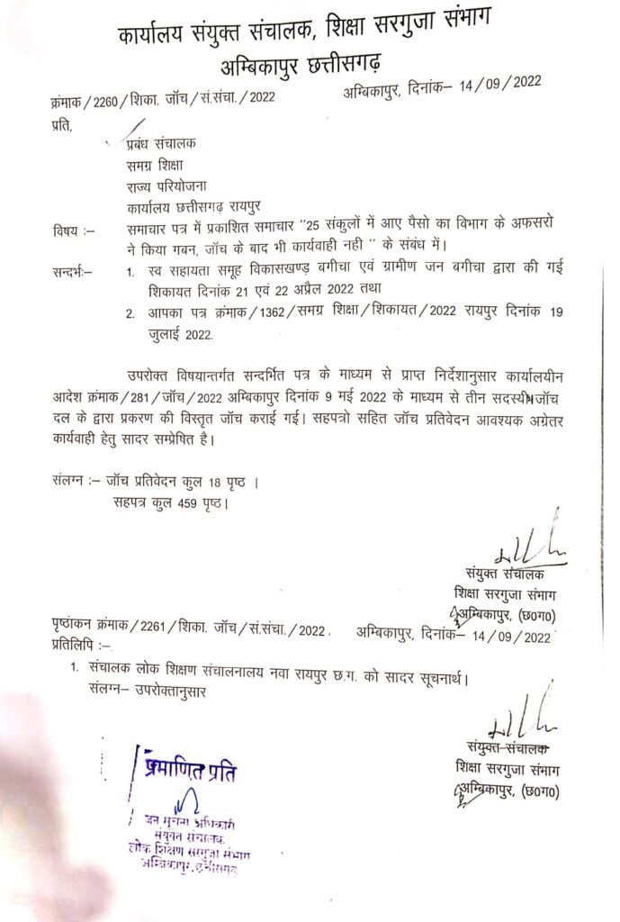 मामला जब शिकायतकर्ताओं के साथ मीडिया में आया तो संयुक्त संचालक शिक्षा संभाग अम्बिकापुर के द्वारा तीन सदस्यी टीम बनाकर जांच शुरू हुई, और जांच में मामला प्रूफ भी हो गया, और तीनों पर गबन सिद्ध हुआ, जांच होने के बाद अब जब महीने को हैं तो कार्यवाही नही हुई तो शिकायतकर्ताओं ने सीएम भूपेश बघेल, शिक्षा मंत्री प्रेमसाय टेकाम, सचिव शिक्षा एस भारतिदासन, प्रमुख सचिव आलोक शुक्ला को ज्ञापन सौंपकर कार्यवाही की मांग की है। वहीं ग्रामीणों के द्वारा सौंपे ज्ञापन में यह भी उद्धरित है कि शिक्षा संचालक सुनील जैन के बीइओ कोशले क्लासमेट होने के कारण मामले को दबाने का प्रयास है, और कार्यवाही नही हो रही है। हालांकि यह जरूर है कि सरगुजा कमिश्नर और शिक्षा संचालक के आदेश पर ही जांच हुई है। पर जांच रिपोर्ट भी इन्ही को गई…पर जब कार्यवाही ने हुई तो सवाल यहीं पर खड़ा हुआ।।
