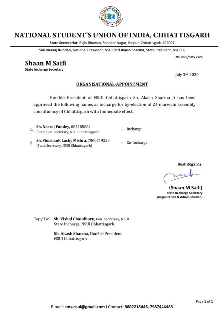 जोगी के गढ़ में नीरज को जिम्मेदारी..NSUI प्रदेश महासचिव को बनाया गया मरवाही उपचुनाव का प्रभारी…