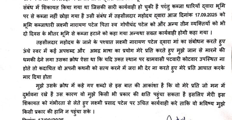 शिकायतकर्ता अजय साहू आरोप है कि जांच में आए राजस्व विभाग के अधिकारियों की टीम के जाते ही बौखलाए अवैध कब्जाधारी लक्ष्मीनारायण पटेल ने ग्रामीणों के सामने ही शिकायतकर्ता को अभद्र भाषा में गलियां देते हुए जान से मारने की धमकी दी है। यदि मौके पर ग्रामवासी, पटवारी और कोटवार मौजूद नहीं होते तो आरोपी उन पर शारीरिक हमला कर सकता था। साहू ने आशंका जताई है कि आरोपी भविष्य में भी उन्हें नुकसान पहुंचा सकता है, इसलिए पुलिस से सख्त कार्रवाई की मांग की है।